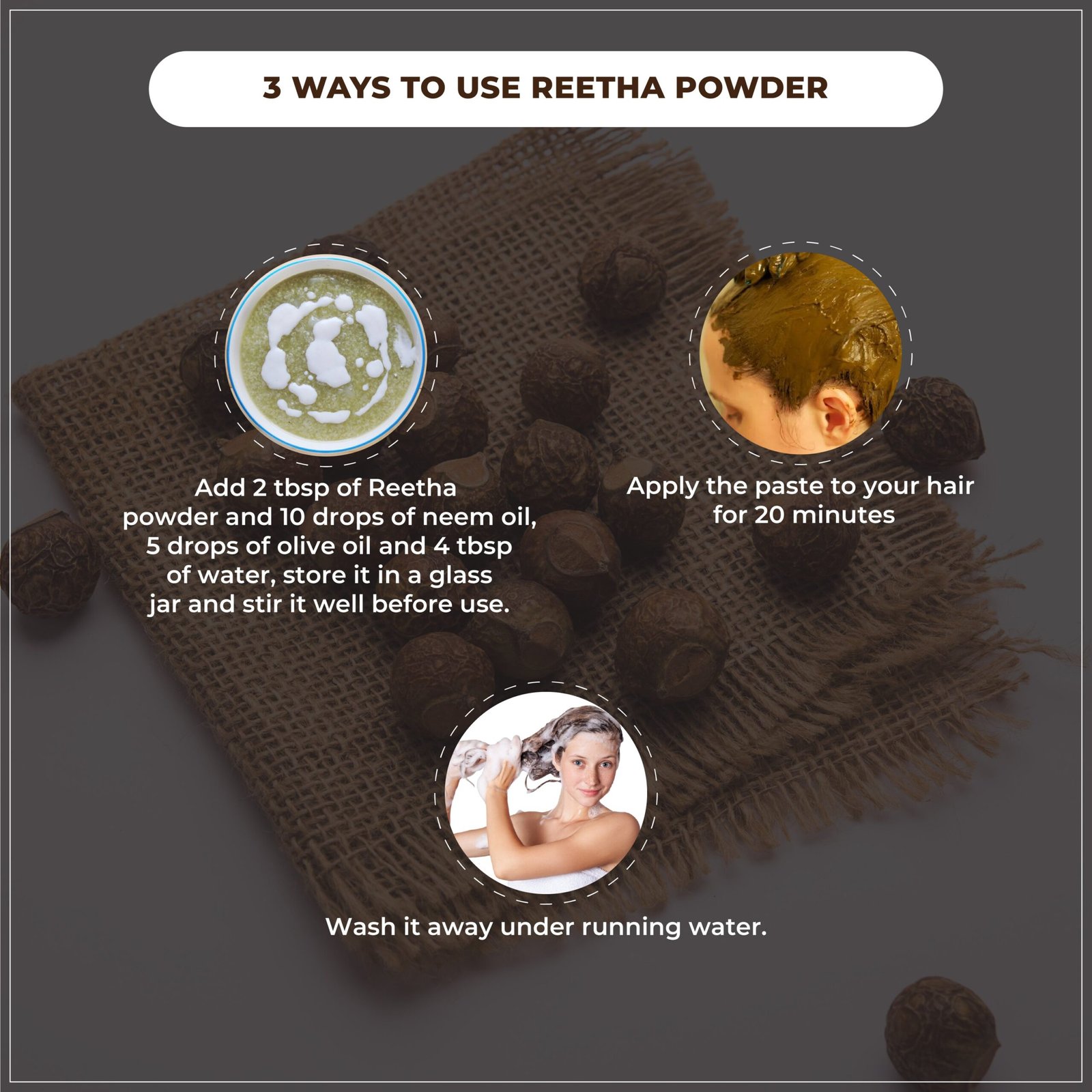 2. Hair Mask: Combine Aritha powder with other natural ingredients like Amla or Shikakai powder. Apply the mixture to the scalp and hair, leave it on for 30 minutes, and rinse with water.