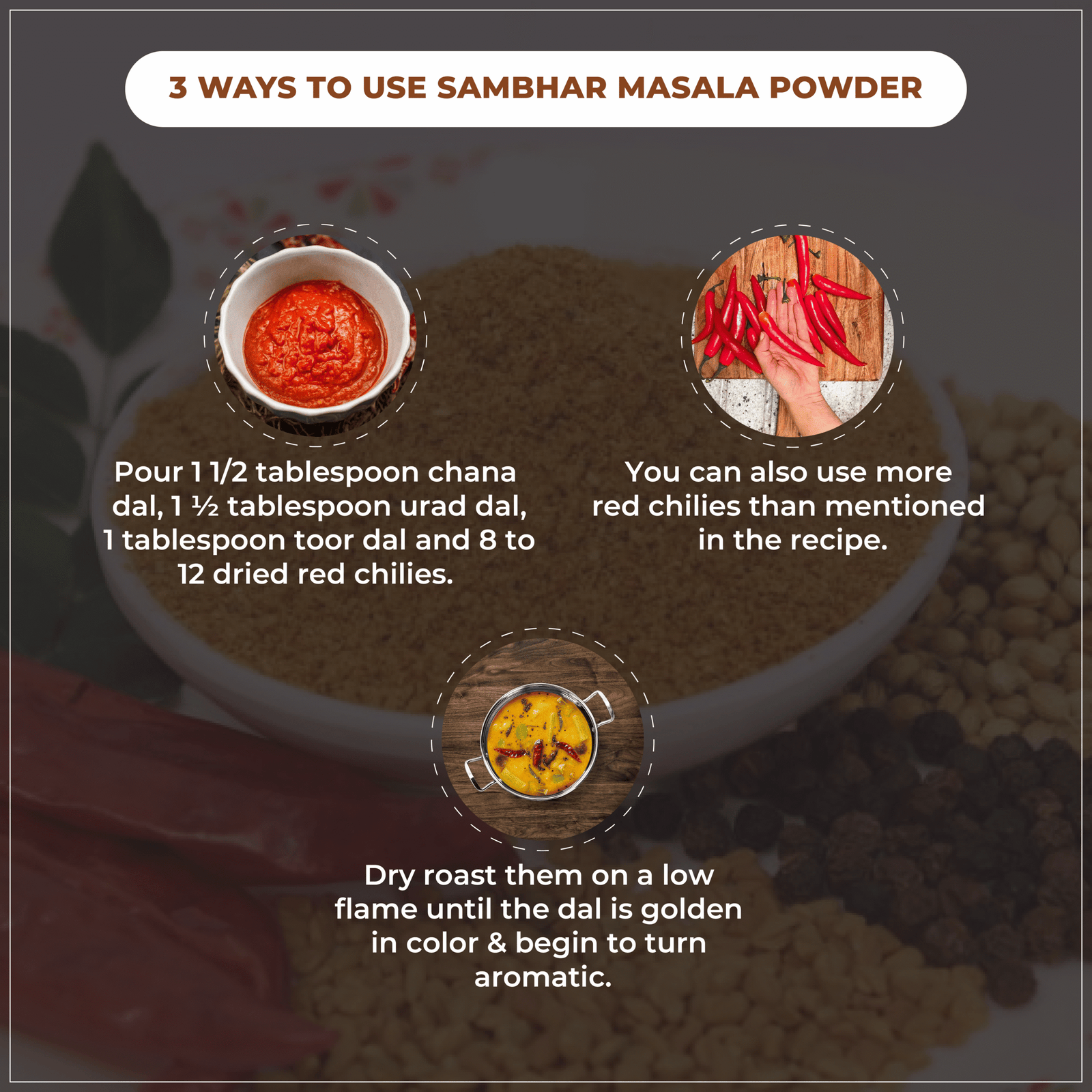 These spices are carefully blended to create a masala that delivers the perfect mix of tanginess, heat, and earthiness, which is essential for a good sambhar.
